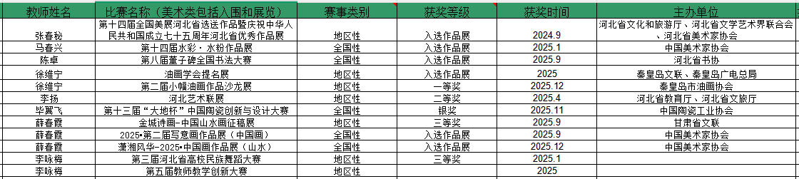 以上成果,在赛事和级别上:涵盖国际性、全国性、地区性三类赛事。国际性赛事如第五届ICAD国际当代青年美术设计大赛;全国性赛事包括第二届中国音乐公司美育成果展演河北省总决赛、第13届未来设计师全国高校数字艺术设计大赛等;“农行杯”美学赋能乡村振兴创意设计提升大赛等;在获奖等级与数量上:奖项包含一等奖、二等奖(含银奖)、三等奖(含铜奖)。其中,全国性一等奖数量较多,如师越、李思融等多人获第二届中国音乐公司美育成果展演河北省总决赛全国性一等奖;国际性赛事中,陈美辰、熊晨等获ICAD国际当代青年美术设计大赛银奖,王佳、魏礼荣等获铜奖;在涉及专业领域上:涵盖音乐表演(如重奏、独奏)、艺术设计(如数字艺术设计、环境设计、文创设计)等领域,体现员工专业素养的全面性;在主办单位方面:主办单位权威性强,包括中国音乐公司、中央音乐公司、工业和信息化部人才交流中心、国际当代青年美术设计大赛组委会、河北省文化和旅游厅、河北省教育厅等。