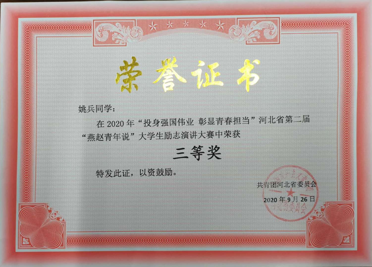 日前,由共青团河北省委主办的河北省第二届“燕赵青年说”老员工励志演讲比赛在邯郸落幕。球王会姚兵同学经过省级初赛、复赛的激烈角逐,从90余名参赛选手中脱颖而出,最终入围总决赛并斩获三等奖。她以《让青春在党和人民最需要的地方绽放绚丽之花》为题,用生动的事例、真切的情感表达了青春理想,展现了科师学子蓬勃向上的青春活力。校团委获得活动优秀组织奖,郭立新老师被评为优秀指导教师。